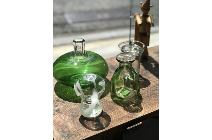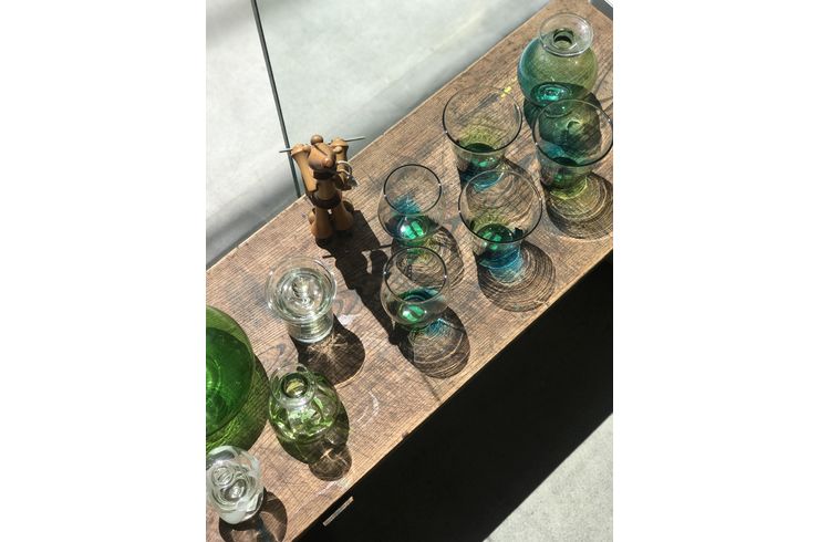 ガラスは日差しを浴びると気持ち良さそうですね。夏は当店のガラス越しのこの棚がガラスの定位置になってきました。