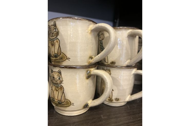 作り手の大宮さんに、右手を挙げた猫ちゃんを作って頂きました!なんて楽しい絵柄なんでしょ。