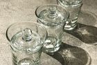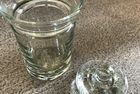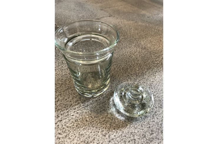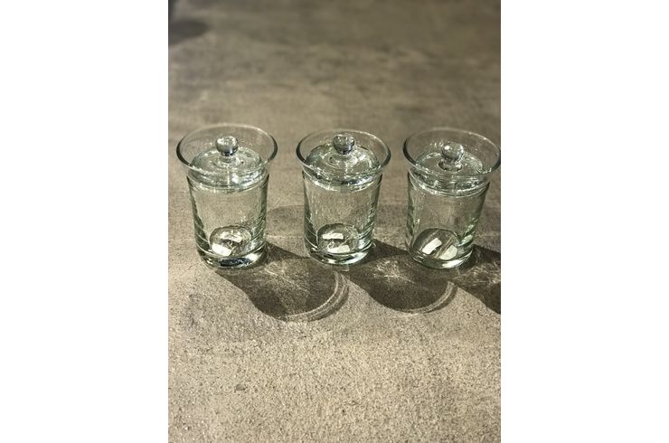 ひとつひとつ手作りのこの蓋付き瓶はガラス工房てとてとさんのもの。原料は真心と泡盛の廃瓶です。
