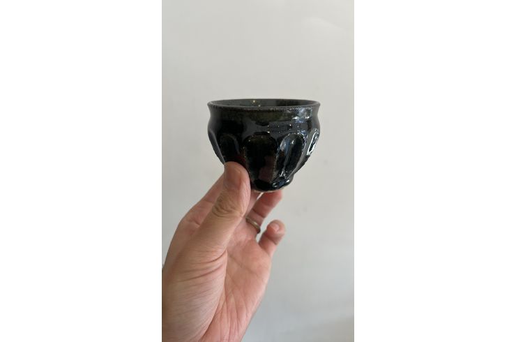 この黒の釉には石炭が練りこまれています。光の角度では緑やBROWNも交じって見え